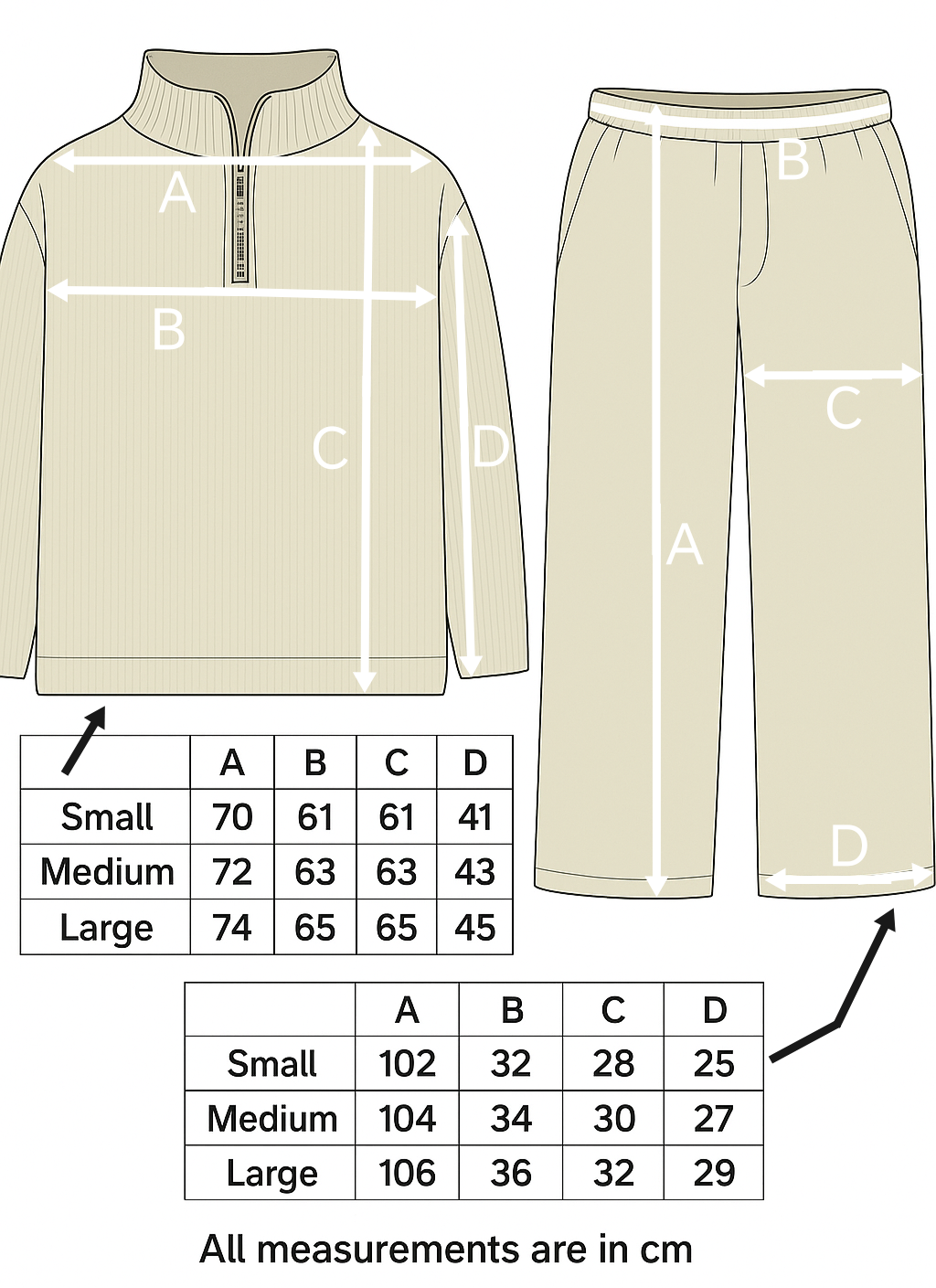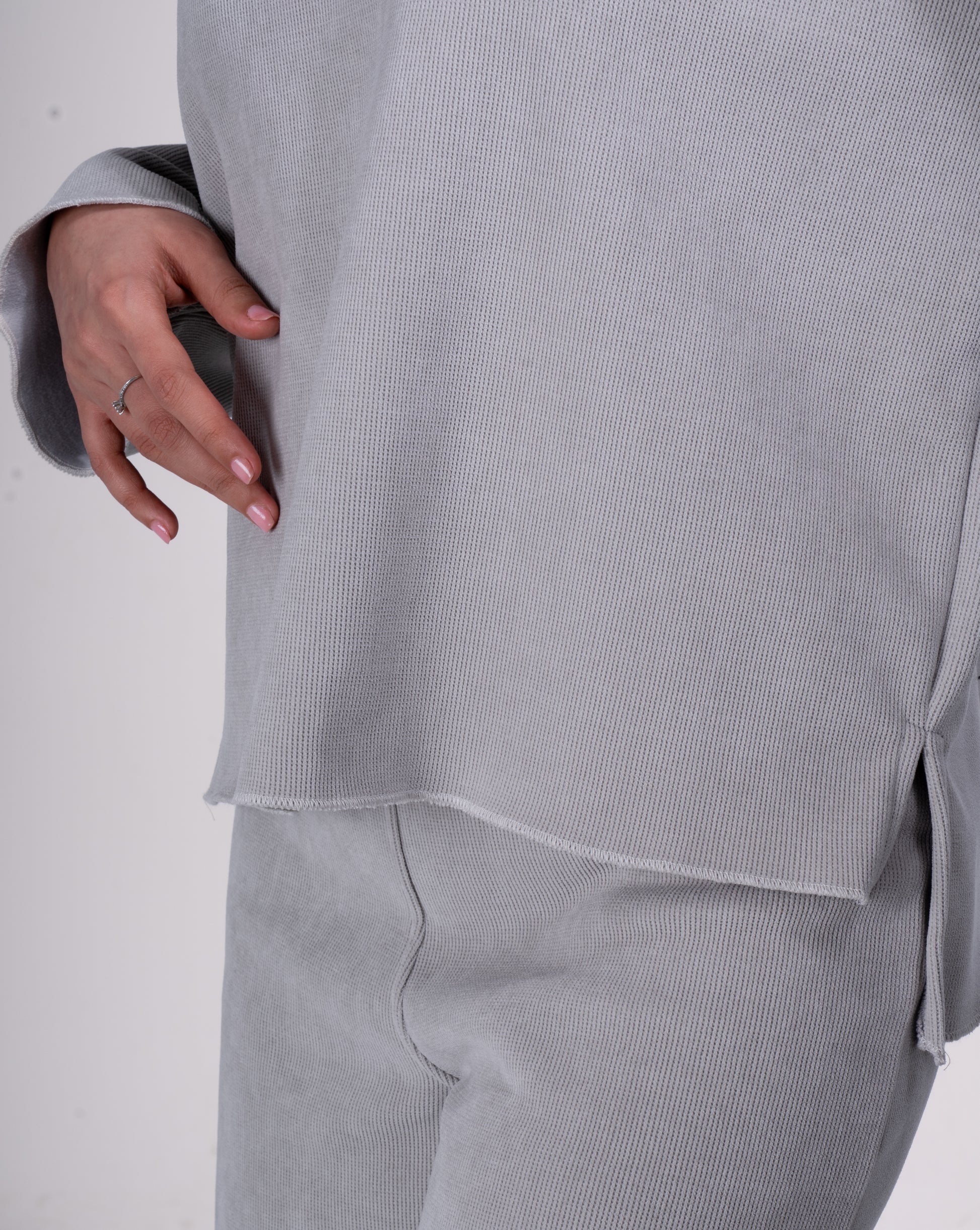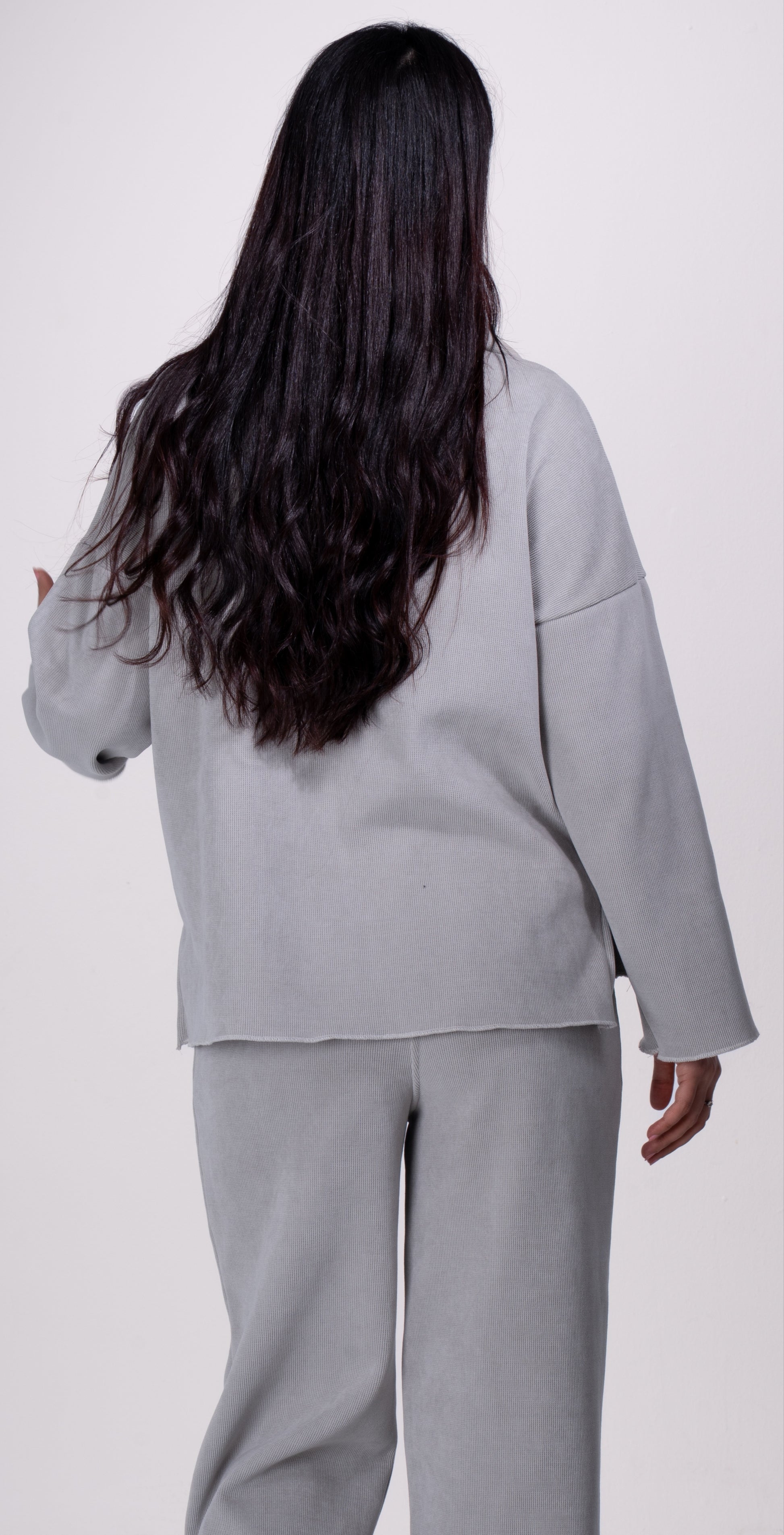 - Pants: Elastic high waist, with ankle slit