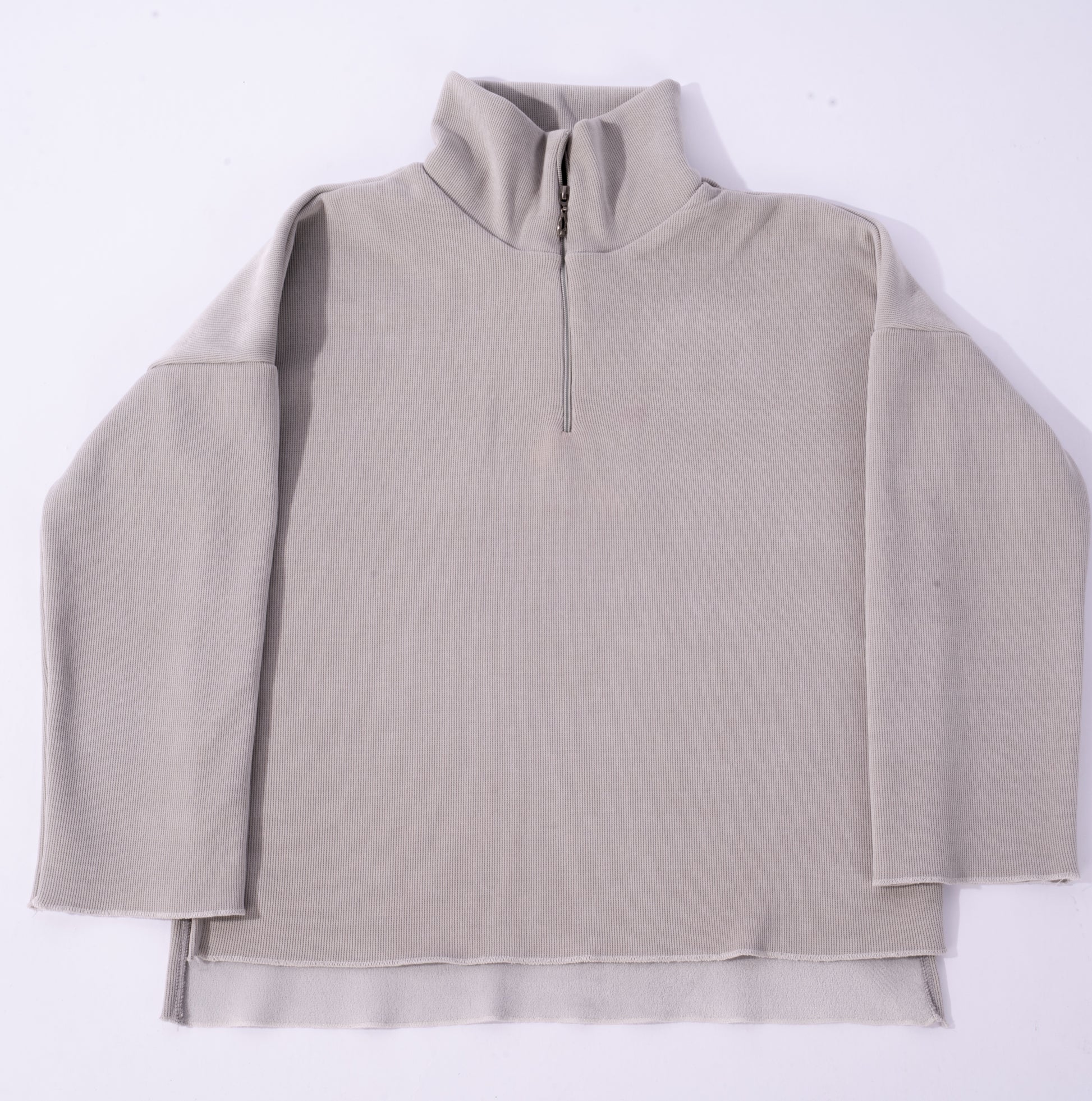 - Top: Half-zip funnel neck, side slits, raw hem finish