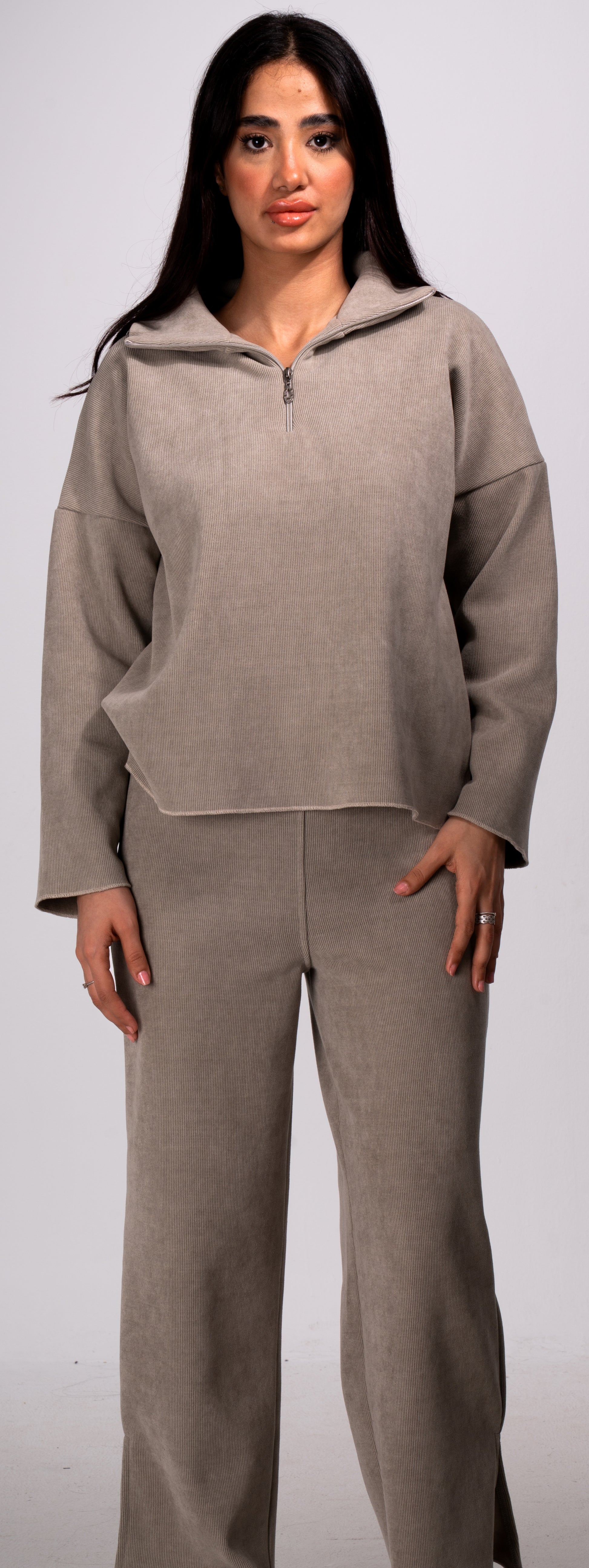 The ribbed half-zip top and pants are crafted from a soft, breathable cotton blend — perfect for going out for brunch, travel, or relaxed days out.